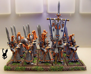 The second unit of swordmasters are of the old metal variety. It is well known that I prefer metal casts due to the durability, sharp detail and reassuring weight, but I have to admit that the newer plastics are far better (for this unit at least). It was interesting to experience the evolution of certain details on the two sculpts. They are similar enough to be recognizable as the same unit, but a lot of things are more defined with more variance (the standard bearer is plastic). I would field the two units mixed (each half plastic and half metal). The burning blue ball returns on the back of the champion's cloak, but the camera is dying so no photographic evidence this time.